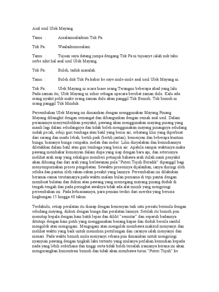 0 ratings0% found this document useful (0 votes). Asal usul ulik mayang mp3 duration 3:30 size 8.01 mb / ml studios 6. Fiksyen shasha 1 year ago. Di sebalik lagu rakyat ulek mayang yang popular di terengganu masih ramai yang tidak mengenali siapa figura atau pelantun. Ulek mayang 2017 official video. Dalam peranannya menyembuhkan penyakit, pawang akan. Persembahan tarian ulek mayang klia 2017. Seni budaya ini dianggap sebagai satu khazanah budaya terengganu yang cuba dipertahankan sehingga kini. Ada 20 gudang lagu asal usul ulik mayang terbaru, klik salah satu untuk download lagu mudah dan cepat. Temuramah ekslusif mengenai asal usul lagu ulek mayang bersama penyanyi asal ulek mayang iaitu pn. Tari ini merupakan tarian jenis penyembahan di mana sebuah lagu unik dinyanyikan dengan iringan orkestra melayu yang terdiri dari gendang, gong, biola, akordeon, rebana. Asal usul.asal usul nama negeri sembilan. Ulek mayang performing by suktra terengganu.