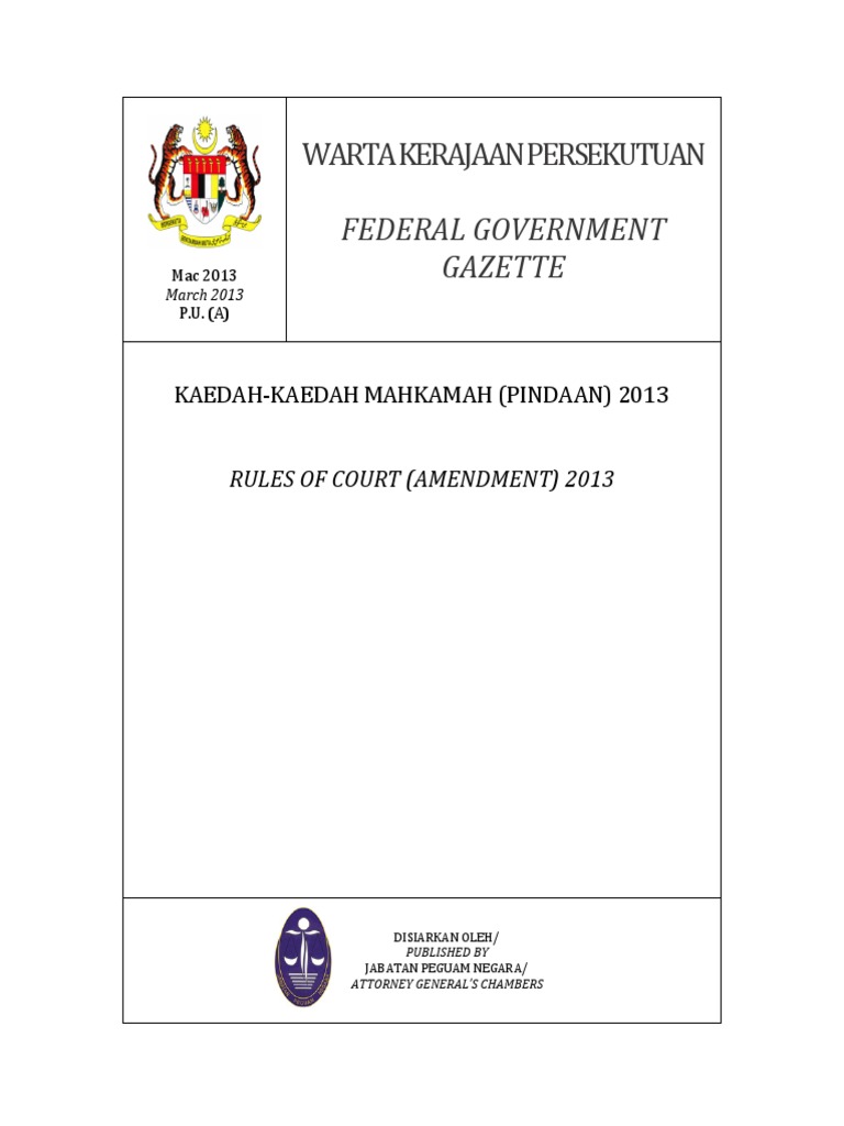 731119085101) zammiyana binti chamirun (no. In view of the recent amendments made to the rules of court 2012 vide p u a 286 2012 we are pleased to enclose herewith a complimentary copy of the amendments to be inserted wherever necessary in your copy of the rules of court 2012. This entry was posted on august 31, 2015 (updated 2037 days ago) version: Mahkamah atau hakim hendaklah mengambil berat keadilan. Dalam kes ini, kami menjadi plaintif, bukannya defendan, katanya. Defendan menurut perintah mahkamah tinggi malaya di ipoh mengenai perintah jualan dan Plaintif dan mohd zaimi bin muhd yunus (no. Kaedah kaedah mahkamah 2012 pdf agc. Sale price rm80.00 / stock: Kaedah kaedah mahkamah 2012 pdf agc. 820304065254) tee fu boon (no. Tarikh difailkan nama kapal kaveat oleh Please select zone singapore malaysia / east malaysia malaysia / west malaysia please select delivery method home delivery rm7 store pickup rm0.