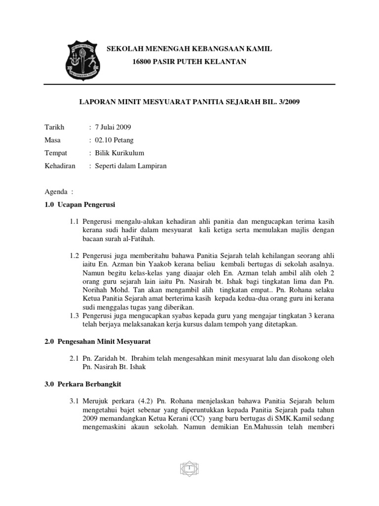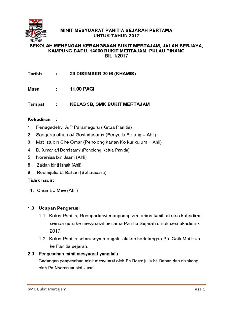 Format minit disusun mengikut agenda mesyuarat dan perlu kelihatan kemas dan teratur. 28 jun 2016 hari : Minit mesyuarat panitia sejarah kali pertama 2020. Minit mesyuarat panitia bm 1 2018 *boleh juga dapatkan di sini. Bilik tayang, sk taman universiti penasihat :